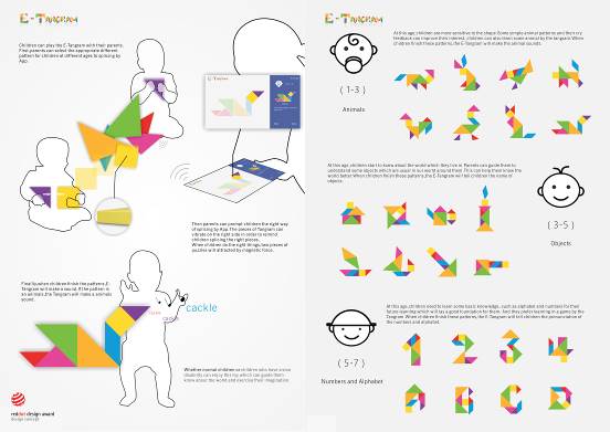 附作品介绍:E-Tangram是一款基于智能技术的益智类玩具产品概念设计。该产品基于传统七巧板原理,利用信息电子技术在每个单元内置入电子元件形成工作模块,在各模块组合形成整体时能够发出对应的声音(如形成天鹅形状会产生天鹅的叫声、形成数字或字母会发出对应的发声),以帮助不同年龄段儿童通过游戏的方式提高动手能力和智力开发。此外家长还可通过计算机编程调整组合体与对应的发声,实现产品的个性化设置,进而帮助和促进家长与子女之间的互动与交流。