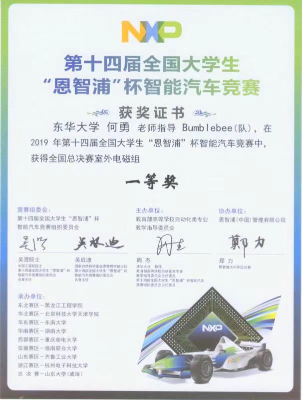 8月25日,2019年第十四届全国大学生“恩智浦”杯智能汽车全国总决赛在山东大学威海校区落下帷幕。由机械学院学生田威、张莲茹等组成的室外电磁组团队继在华东赛区预选赛中获得一等奖后,在何勇教授的指导下经过激烈角逐,获得全国总决赛一等奖。这是yl6809永利YL集团学生首次在该项赛事中获得佳绩,实现历史性突破。