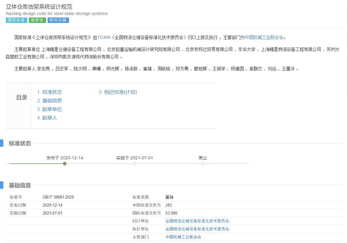 《立体仓库货架系统设计规范GB/T39681-2020》标准的制定将进一步规范或完善立体仓库货架名词术语,引导企业规范化设计、规模化生产,同时也为生产商、经销商、消费者、质检、工商等相关机构提供了统一的交付验收规范。