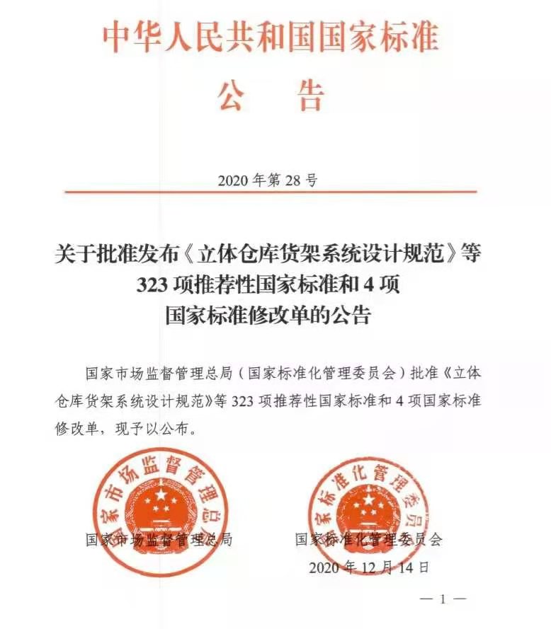 近日,国家市场监督管理总局(国家标准化管理委员会)下发通知,由我院参与编制的《立体仓库货架系统设计规范》国家标准GB/T39681-2020正式获批发布。该标准依据国家标准化管理委员会国家标准制修订计划(国标委综合〔2014〕67号文,计划编号为20140861-T-604),由全国物流标准化技术委员会(SAC/TC 269)提出,并由该委员会与全国物流仓储设备标准化技术委员会(SAC/TC 499)归口,标准研制工作得到上海市创新行动计划项目(标准专项:15DZ0500400)和上海市自然科学基金项目(15ZR1400600)资助。