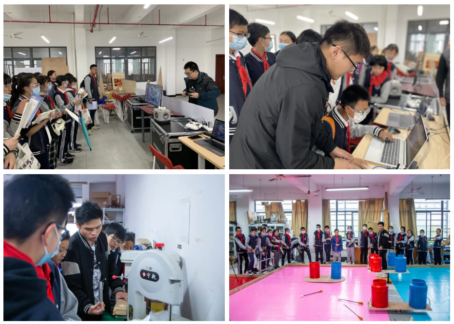 在大学生课外科技创新实践基地,学院机器人社的老师同学们为附校的中学生们详细讲述了同学们自己设计制作的各类机器人,并进行了机器人射击对抗演示。