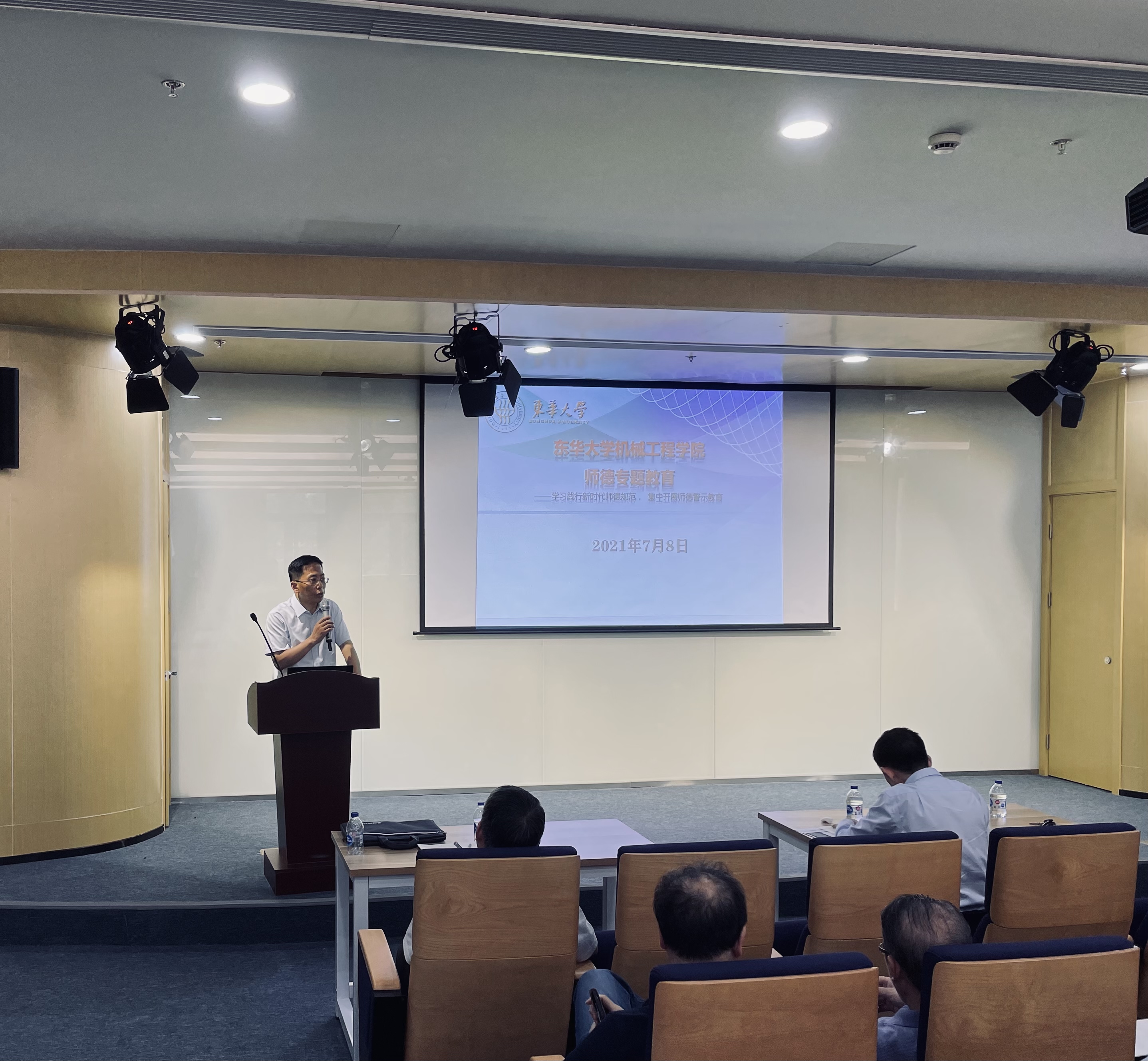 党委书记王新厚代表学院党委宣读了教学基层组织负责人换届后人选名单。为进一步加强本科教育教学工作,本次各教学基层组织均配备了副主任人选。在随后的师德师风专题教育讲座中,王新厚书记带领大家重温了《新时代高校教师职业行为十项准则》和《教育部关于高校教师师德失范行为处理的指导意见》,并以近年来高校中师德师风的典型反面案例对大家进行警示教育,号召大家学习王红旭同志先进事迹和崇高精神,提出了学院今后师德师风学习教育的具体要求。