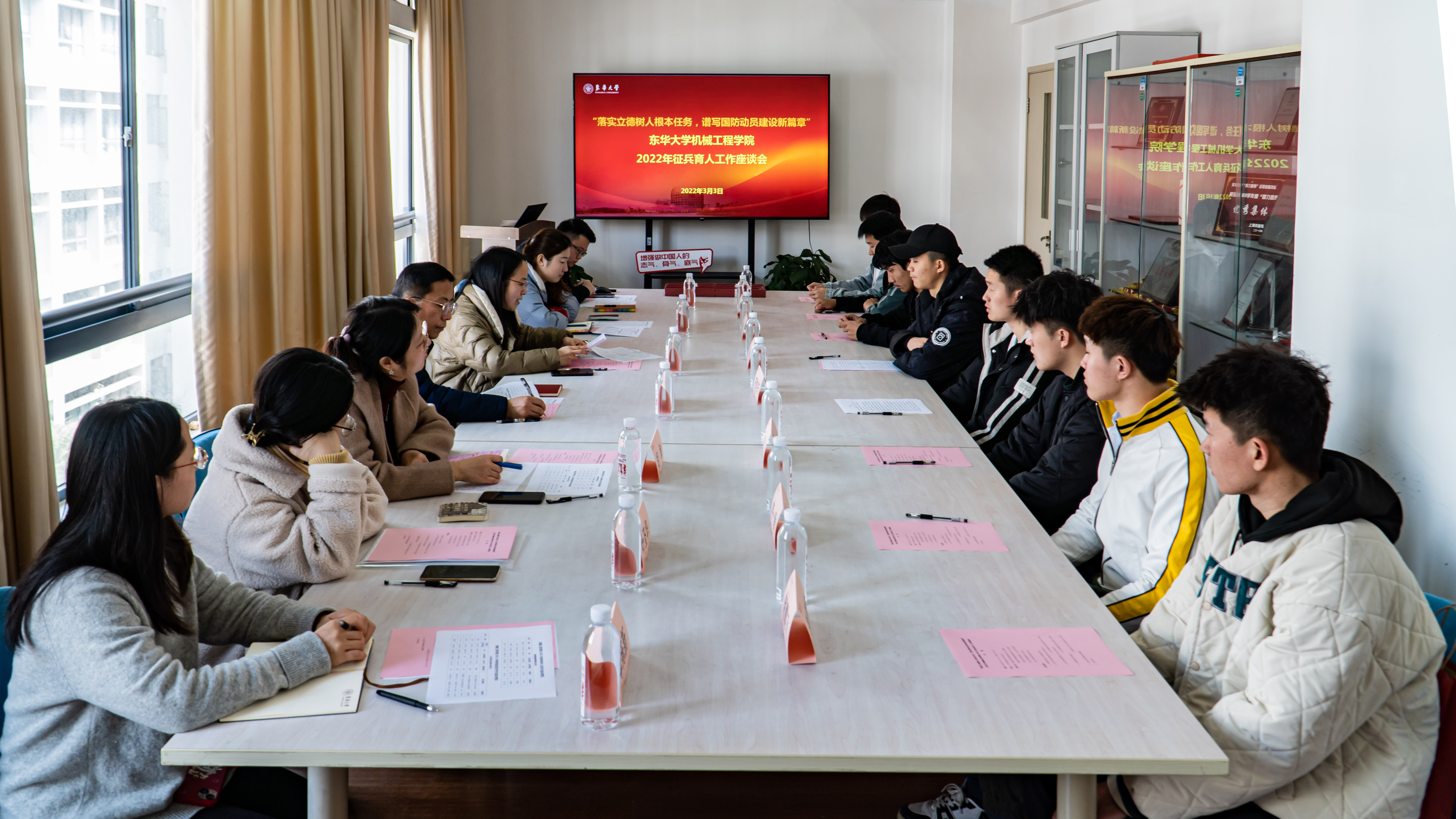 为进一步强化征兵育人工作,推动征兵育人成效不断彰显、工作体系不断完善,3月3日,机械学院党委在4号学院楼4042会议室召开“落实立德树人根本任务,谱写国防动员建设新篇章”2022年征兵育人工作座谈会,学院党委书记王新厚、党委副书记李宁蔚、本科生各年级组长、征兵工作负责人、2022年春季报名参军入伍学生及2021年秋季退役复学学生出席。