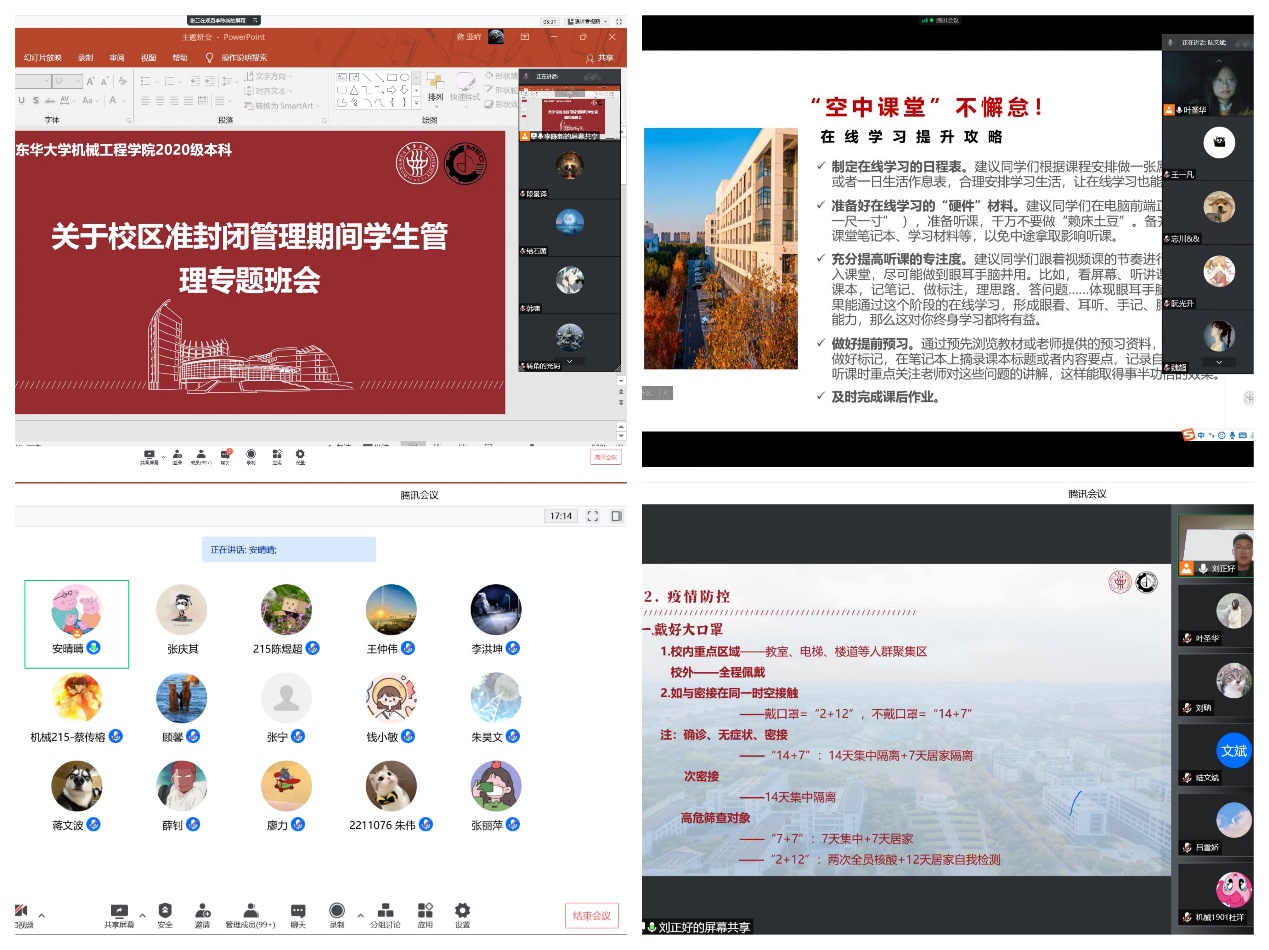 同年级学生需求,有针对性做好咨询和帮扶;利用“机动天下”、“东华机械人”等平台营造同心抗“疫”、共促学风的良好氛围,引导学生做到疫情期间思想进步“不掉线”。