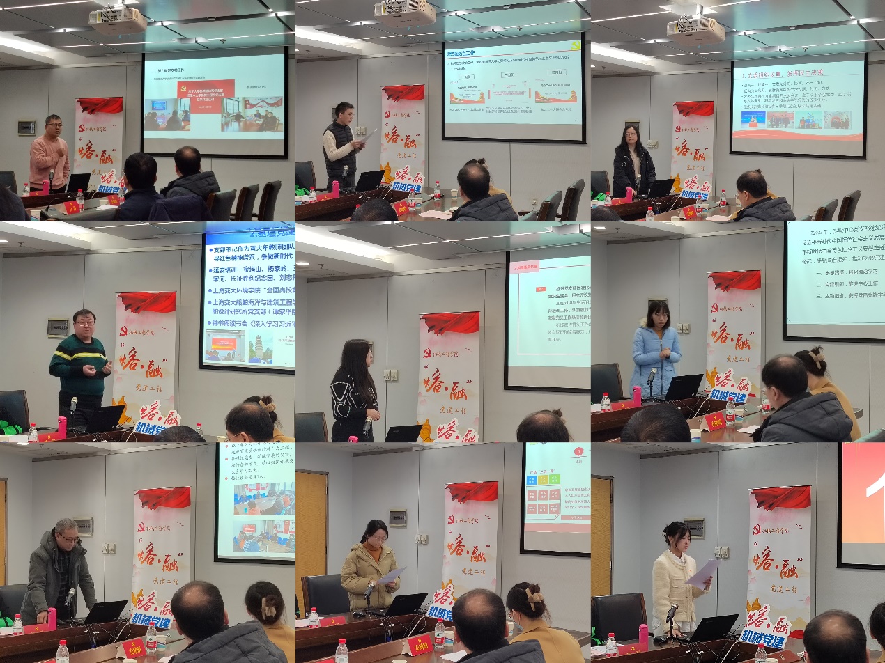 会上,机械基础系党支部书记白云峰、机械设计系党支部书记李寿航、机械制造系党支部副书记李康妹、机械电子系党支部书记盛晓伟、工业设计系党支部书记倪敏娜、机械实验中心党支部书记陈玉洁、工程训练中心党支部书记原一高、学院办公室党支部书记黄璐、匠心扶智本科生党支部书记叶圣华、筑梦创设“一站式”学生社区党支部书记李芷筠等10位同志分别就支部党建工作作了述职既客观总结成绩、展示成果,又直面问题、深入分析原因,并厘清了进一步改进工作的思路与规划。