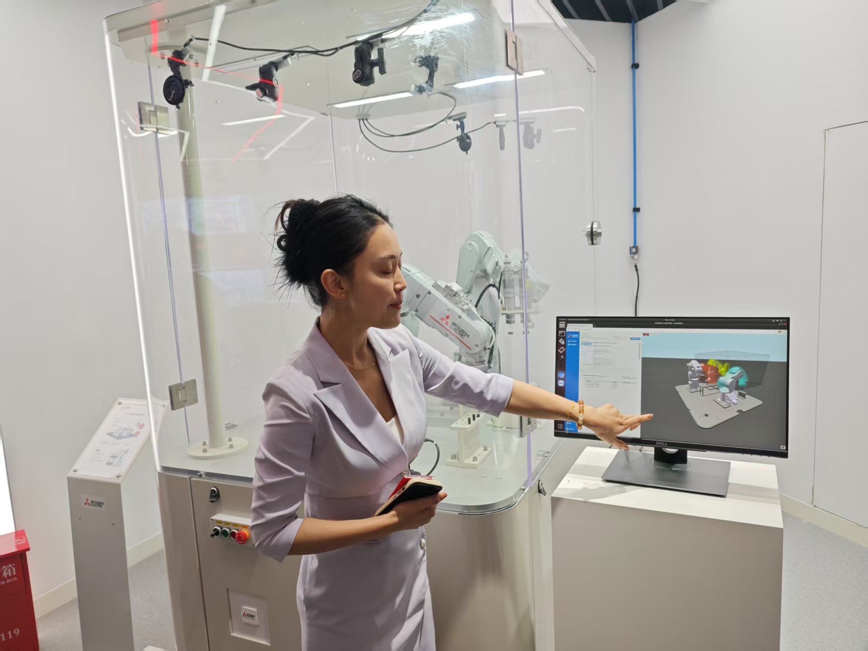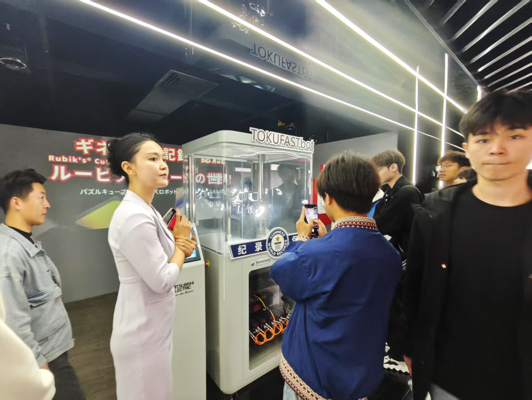 在智能机器人技术展区,团队重点观摩 TOKUFASTbot 高速机器人。其 0.305 秒还原三阶魔方的世界纪录级表现,背后是三菱电机独创的 AI 色彩识别算法与纳米级运动控制技术。在五轴联动机械臂工作站,学生通过力控编程实现柔性装配,系统学习机器人运动学建模与轨迹优化方法。