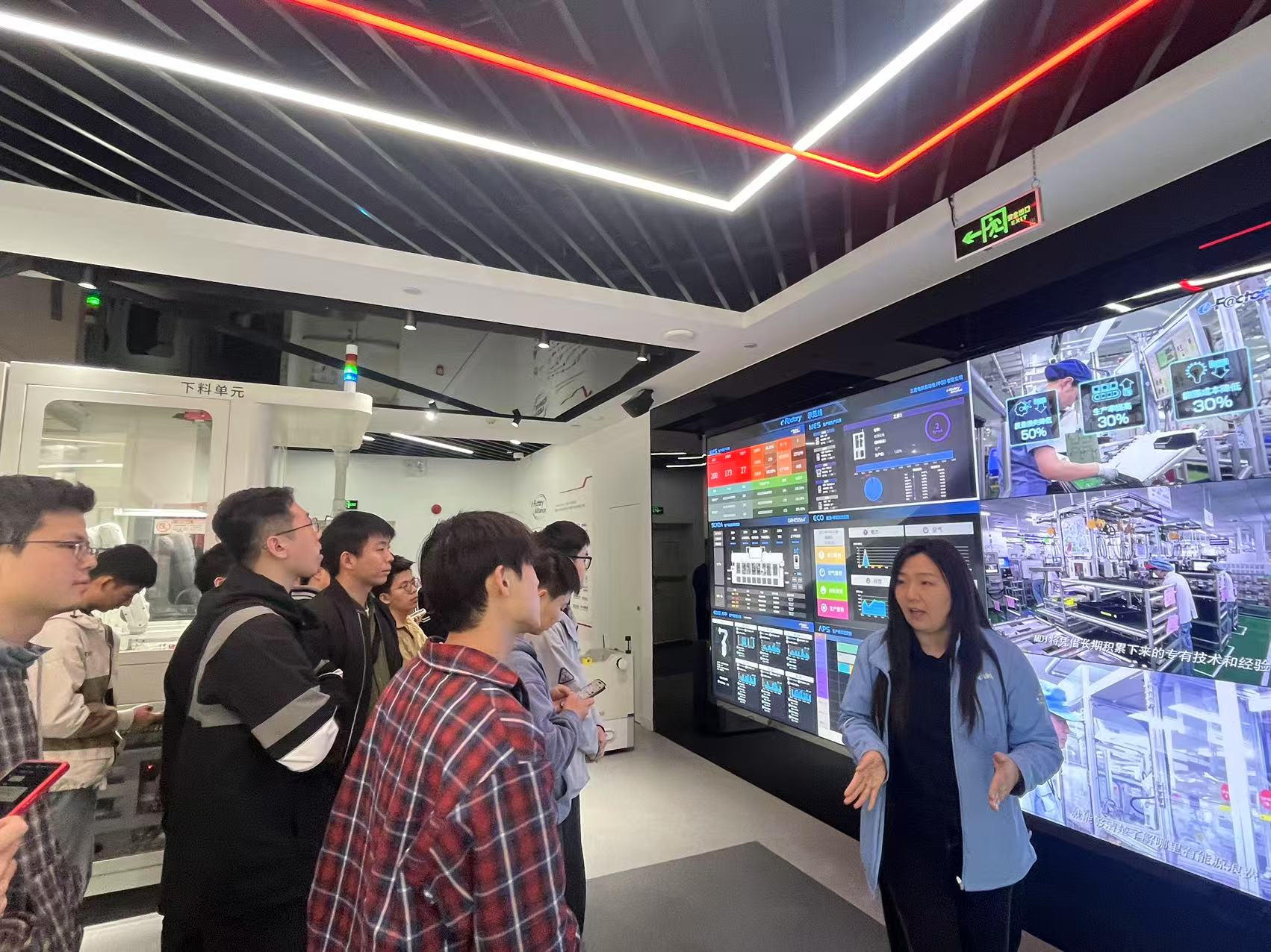 在三菱电机技术专家的引导下,师生团队系统参观了技术展区。在AI 与数字化制造展区,团队深度体验三菱电机自主研发的 MELSEC MX 控制器。该控制器采用多核处理器架构,集成运动控制、视觉检测和边缘计算功能,可实现 128 轴同步控制,响应速度达 1.2ms。学生现场操作其数字孪生系统,通过虚拟调试优化产线布局,直观感受 "数字主线" 技术对生产效率提升的革命性作用。