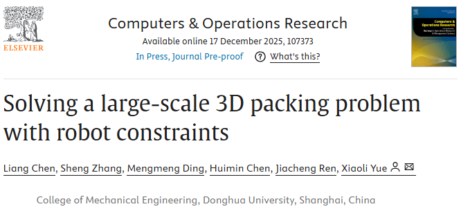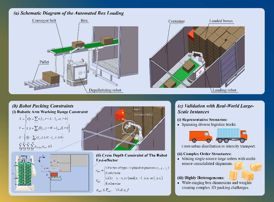 近日,我院智能装备与软件系统团队在机器人卡车装箱优化算法研究方面取得重要进展。该工作近期以“Solving a large-scale 3D packing problem with robot constraints(解决具有机器人约束的大规模三维装箱问题)”为题发表于《Computers & Operations Research》。yl6809永利YL集团为第一单位,青年研究员陈亮为本文第一作者,岳晓丽教授为本文通讯作者。